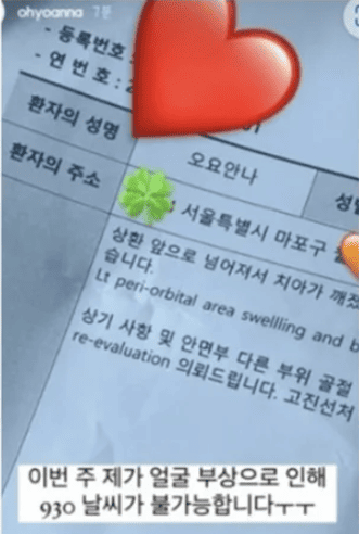 앞서 그는 지난해 9월 사망 직전 소셜미디어에 병원 진단서를 올렸다. 그는 채널 스토리에 "상환 앞으로 넘어져서 치아가 깨졌다. 안면부 다른 부위 골절"이라 적힌 진단서를 올리며 "이번 주 제가 얼굴 부상으로 인해 '930 뉴스' 날씨가 불가능합니다"라고 전했다.